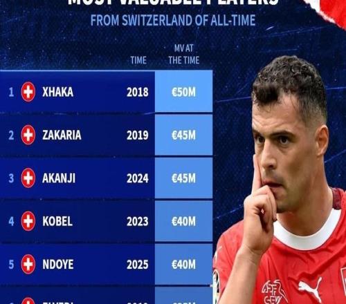 德转列瑞士球员历史身价前10:扎卡5000万欧第1,阿坎吉第2
